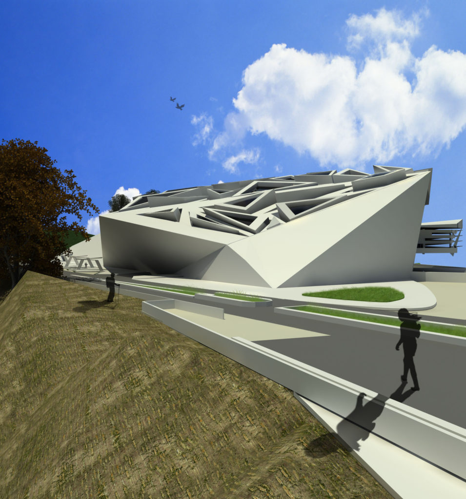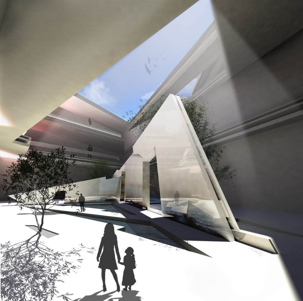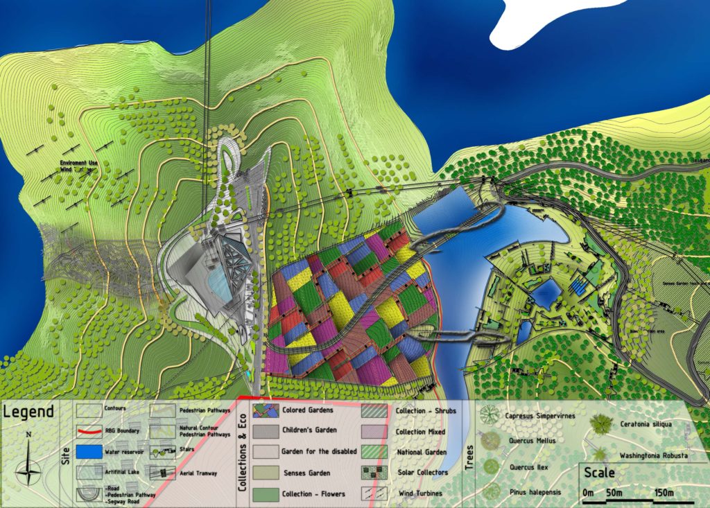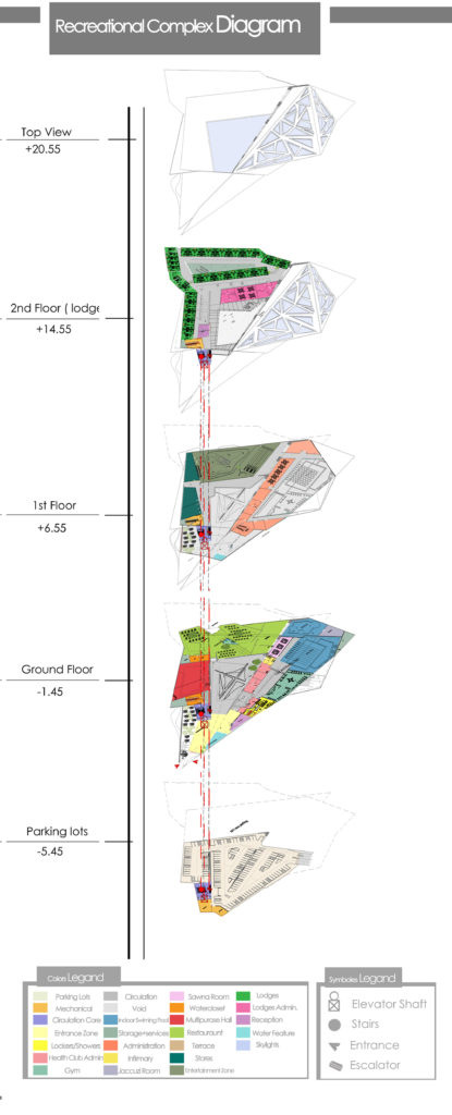 The master plan consists of, an artificial lake, a colored garden and recreation complex. The composition of the recreational complex describes itself as a continuity of the slopped terrain, by that the natural forces of the site sculpted the composition, the function the spaces is driven by the sculpted skylights which allow to a series of designed light and shadows to penetrate to the interior space. A computational simulation for the tree shadow is applied with the sun effect for the rectangles to allow the sun to enter the spaces at a selected time of the day.