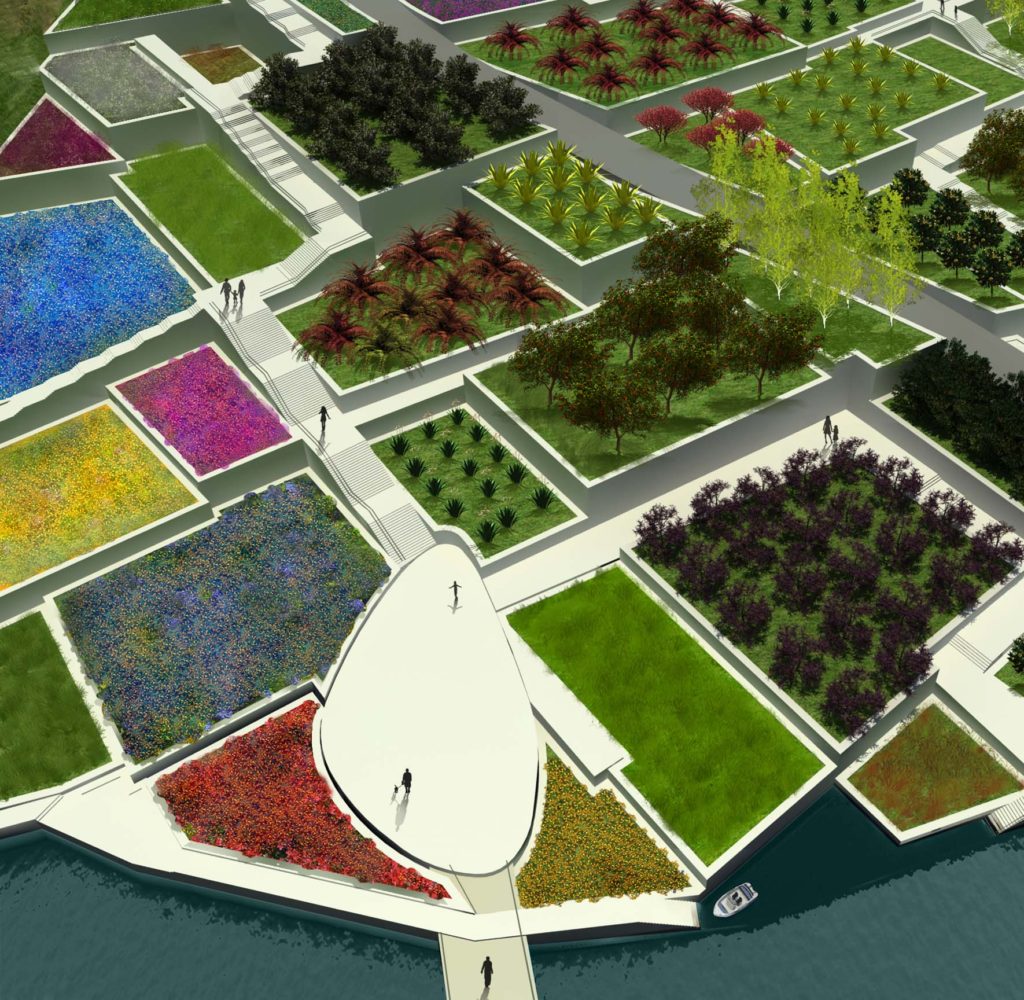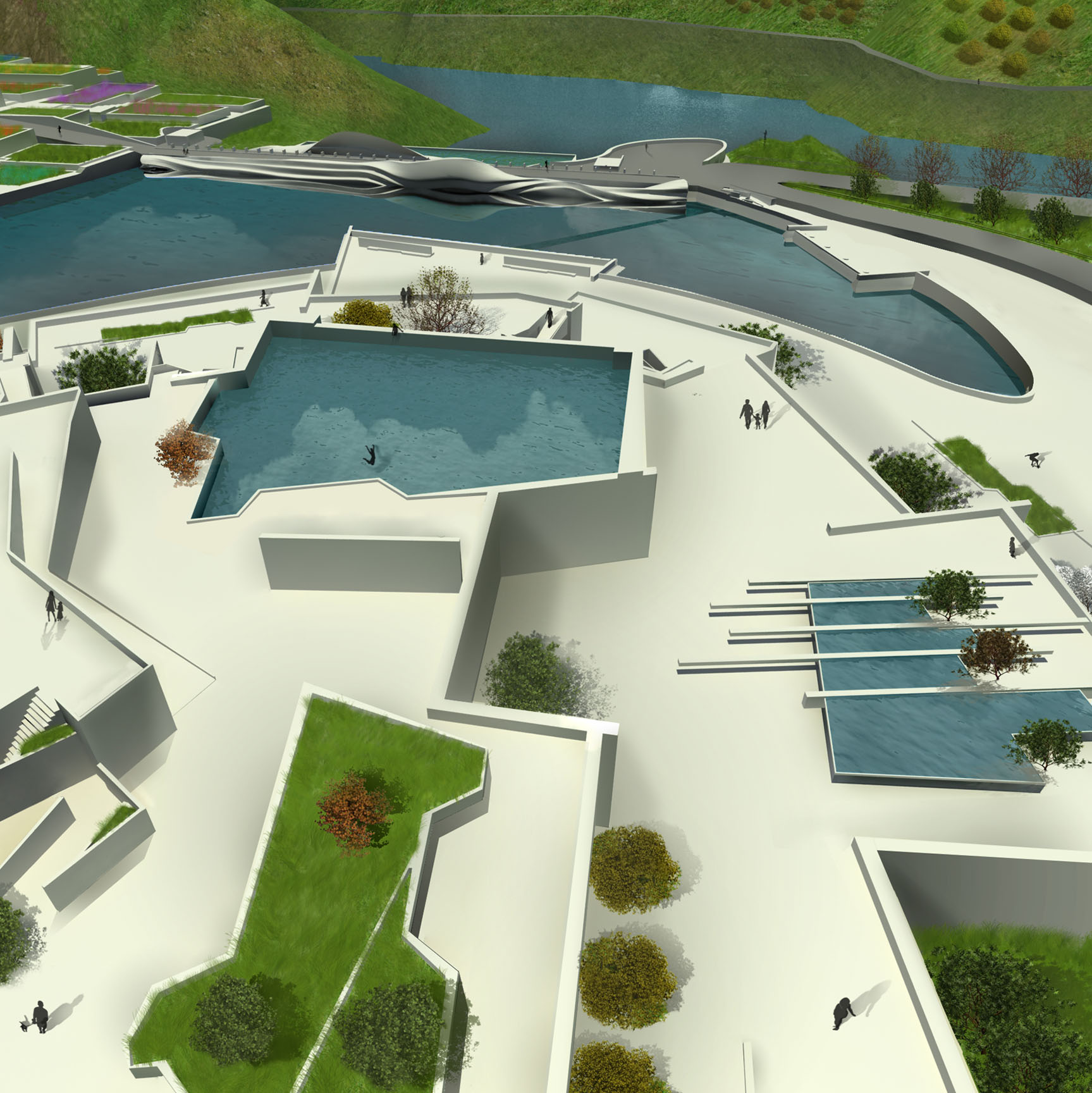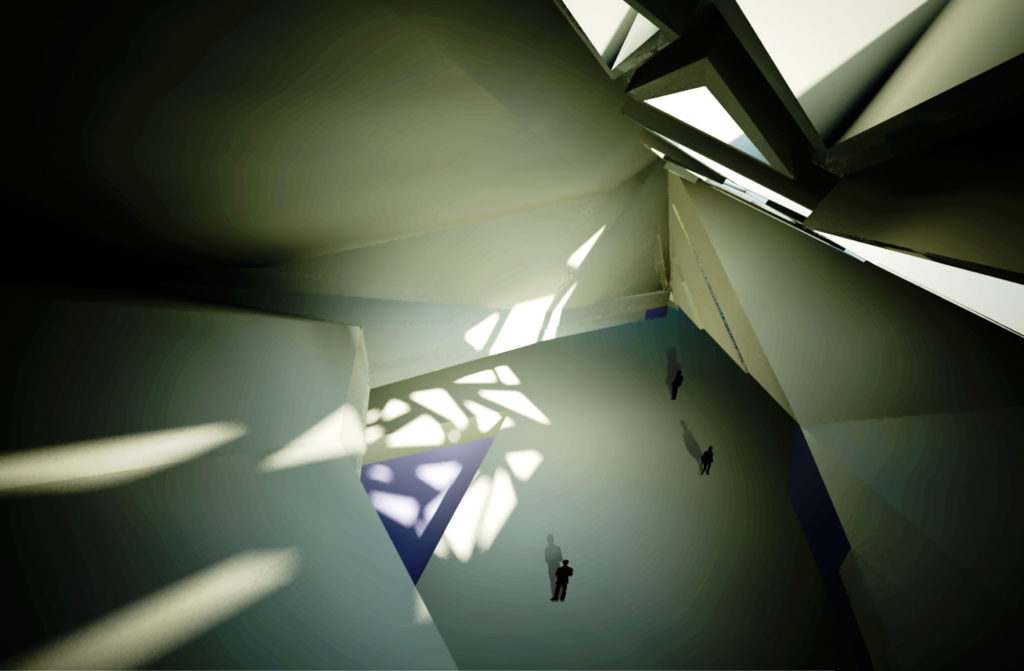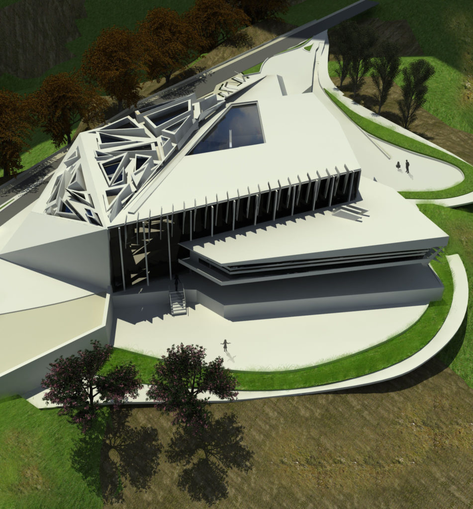 The master plan consists of, an artificial lake, a colored garden and recreation complex. The composition of the recreational complex describes itself as a continuity of the slopped terrain, by that the natural forces of the site sculpted the composition, the function the spaces is driven by the sculpted skylights which allow to a series of designed light and shadows to penetrate to the interior space. A computational simulation for the tree shadow is applied with the sun effect for the rectangles to allow the sun to enter the spaces at a selected time of the day.