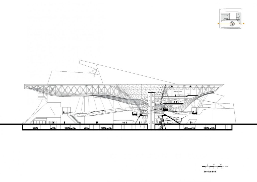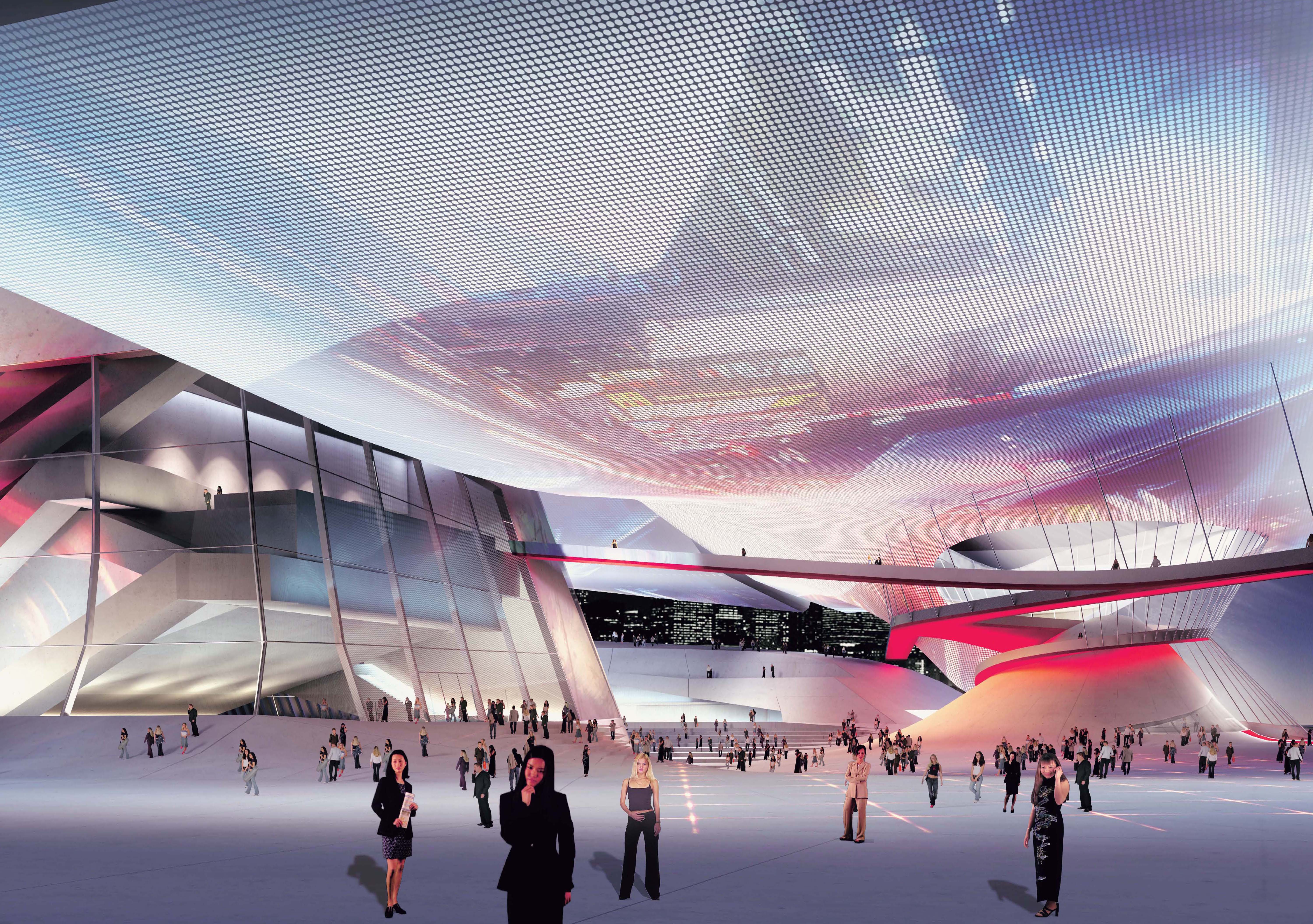 While the movie theaters are located in a mountain-like building, the Center’s public space is shared between an outdoor cinema and a huge public space which is called Red Carpet Area – i.e. reception area. The Red Carpet Area is actually three-dimensional: across a ramp which leads along a double cone the guests of honour reach the reception hall. Each of the two areas is overarched by a huge roof, one of them measuring 60 x 120 meters – the size of a soccer field – and cantilevering 85 meters."