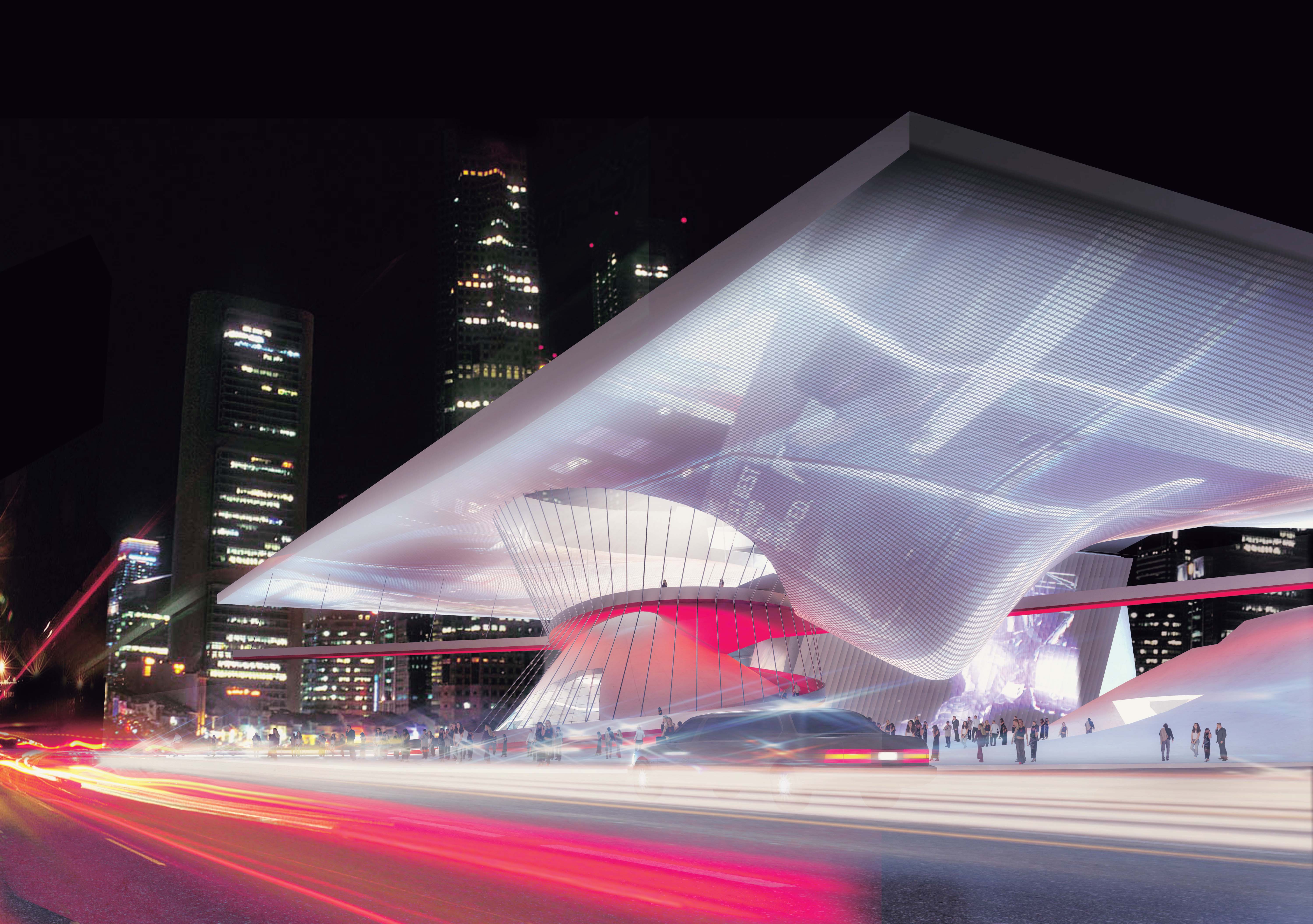 Coop Himmelb(l)au’s design for the Busan Cinema Center, which serves, among other things, as the site of the Busan International Film Festival (BIFF), represents a new combination of culture, entertainment, technology, and architecture with a public space. The concept envisions an urban center with superimposed areas: the Urban Valley, the Red Carpet Zone, the Walk of Fame, the Memorial Court, and the BIFF Canal Park. The buildings house theaters, cinemas, a conference center, offices, production studios, and restaurants, whose spatial boundaries flow into one another in a mixture of protected interior spaces and outdoor spaces, the largest of which also functions as an outdoor cinema with seating for 4,000 people.