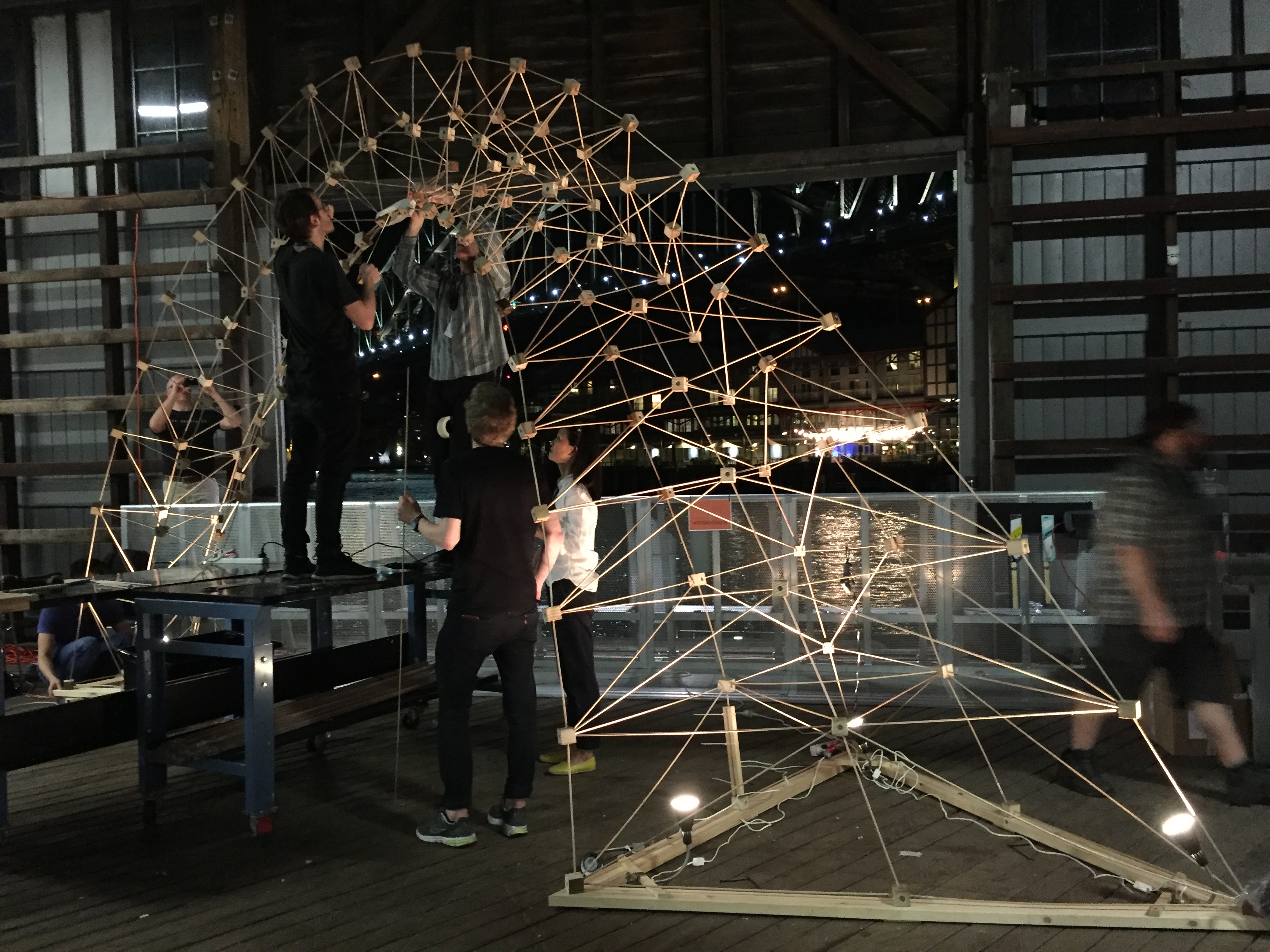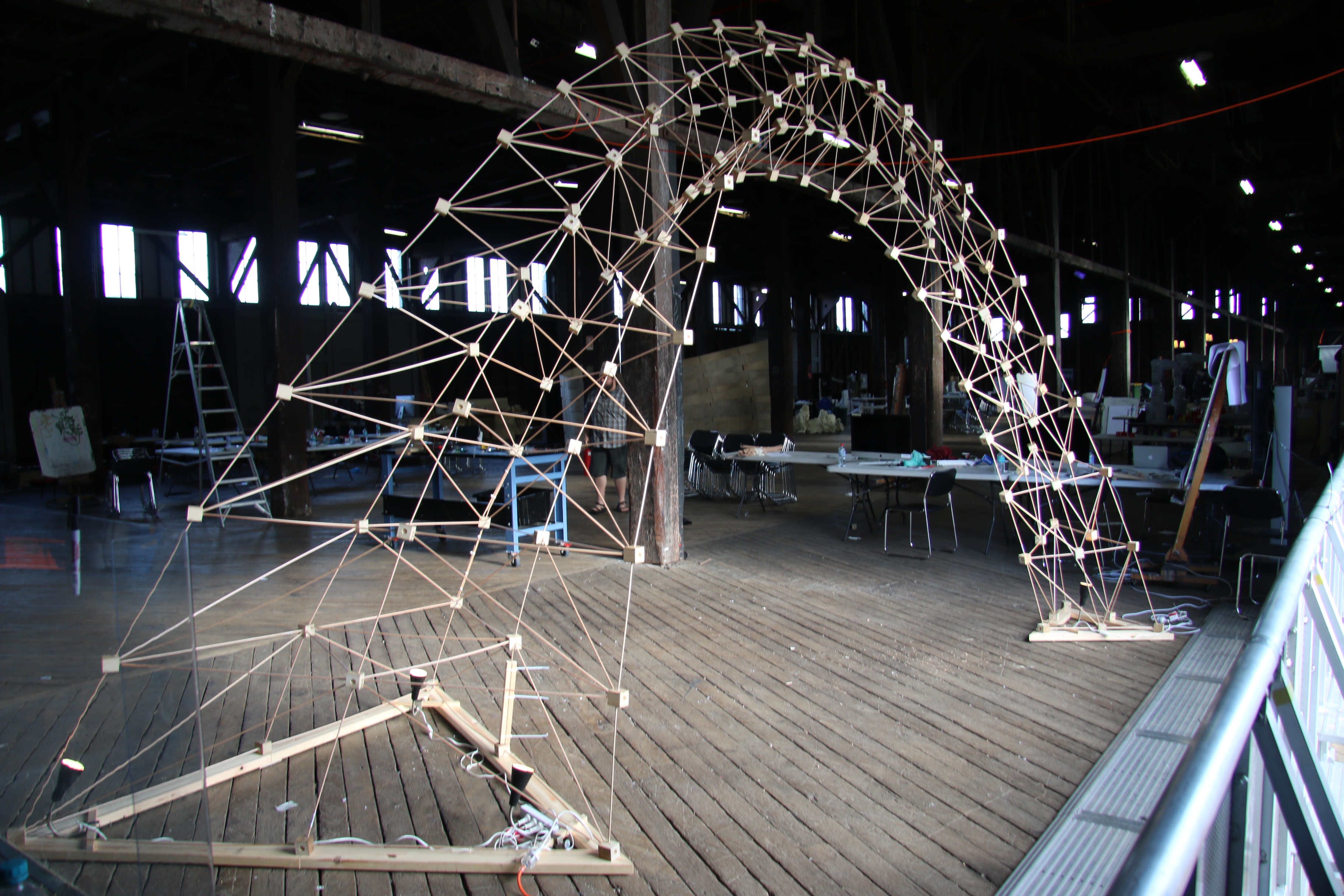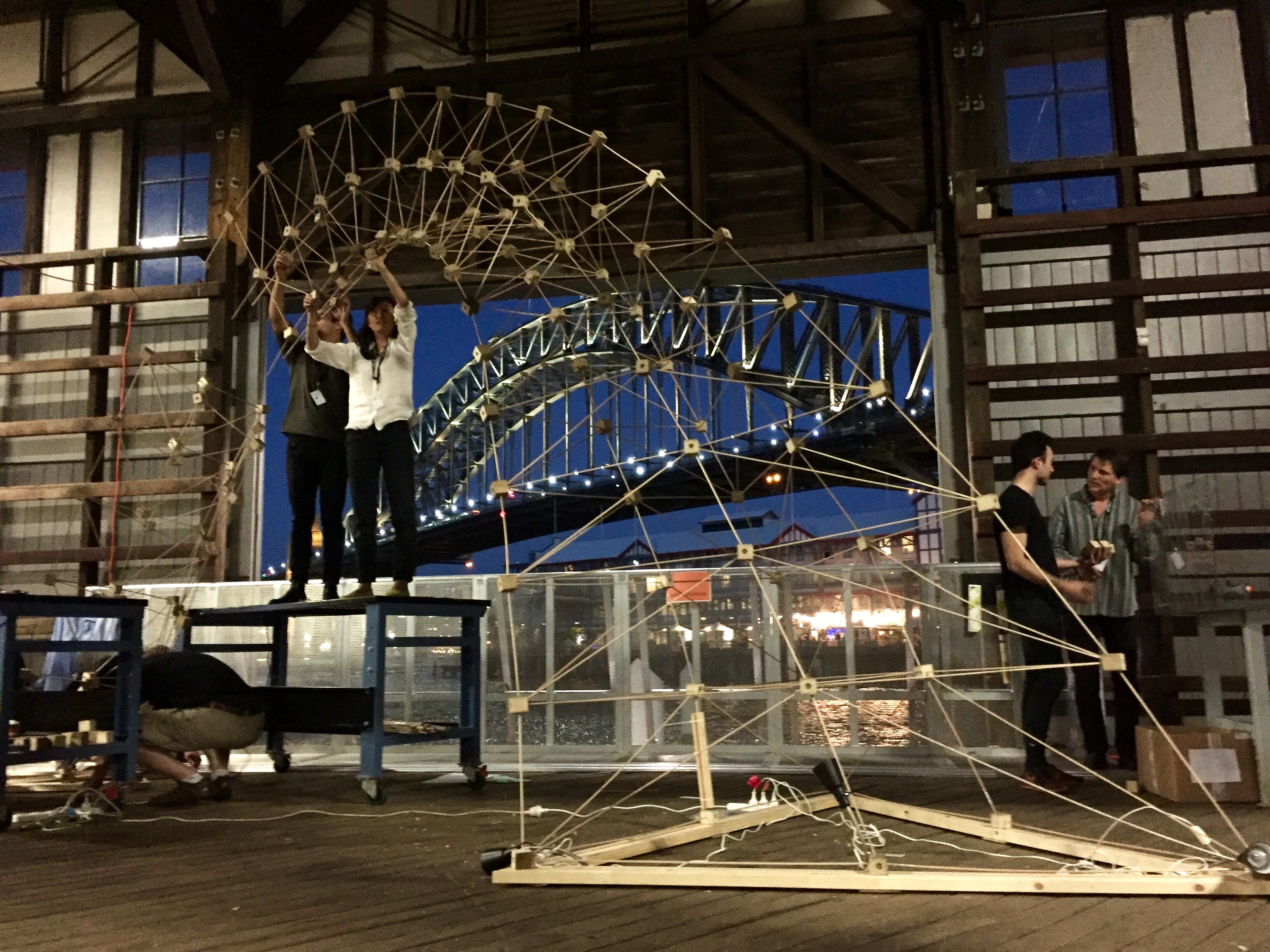 Using a combination of Dynamo, Autodesk React Structures, and the new Dynamo-to-Robot workflow, this workshop explored integrated computational design and structural optimization-to-robotic fabrication workflows to design, evaluate, and fabricate a large format prototypical spatial structure using human-machine collaboration. The Rob|Arch workshop was the first public test of the new Dynamo-to-Robot plugin. This new plugin integrates into the advanced functionality of Dynamo to allow for the visualization of popular types of robots directly in the design environment and for simulation of possible toolpaths and movements.