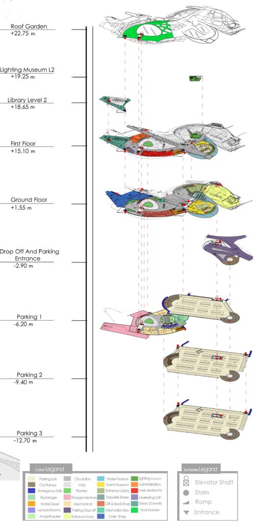 The main composition revolves around the topographical flow of the natural lines at the site; it transforms its mass with ascending elevation as if it was growing from the earth to become a more architectural mass , this transition is controlled by the main datum wall of the composition which in fact is a bridge in the middle of the building. When the composition becomes functional it starts triggering the human senses like sight with its charismatic facade by playing with the human perception of the growing lines , the building also provides a wide range of visual recreational facilities like art and light galleries and a theater , the acoustics like the- passive- which are represented by the natural reflection of the sound from its surfaces and –active- which interact through the landscape like the murmur of the water features , smell which are represented by the essence of the plant presence in the environment and the scent chambers in the scent factory which is one of the recreational sides of the project.